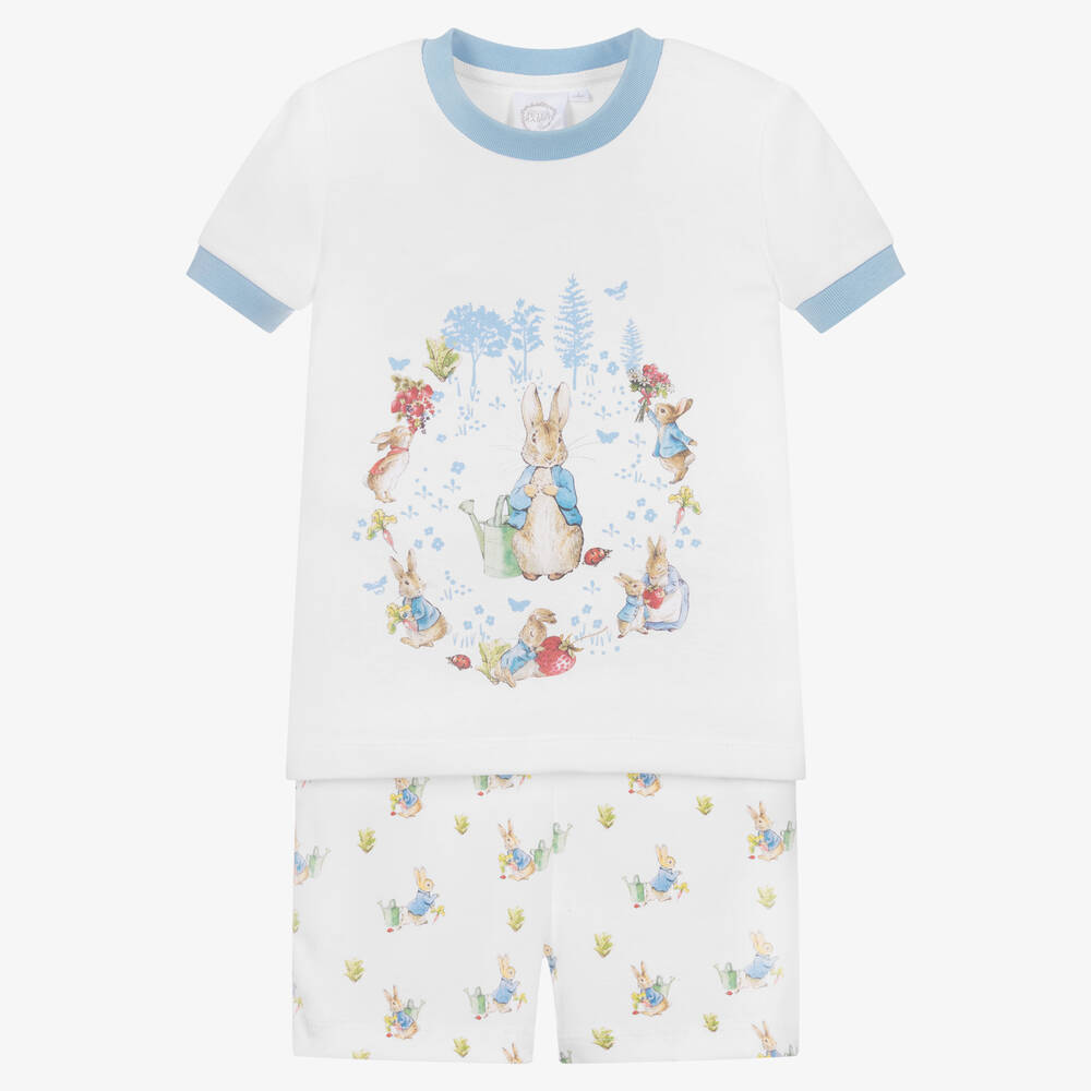 Charming Peter Rabbit™ by Childrensalon short cotton pyjamas for boys and girls, made in comfortable white and pale blue jersey. The top has an adorable original Peter Rabbit illustration by Beatrix Potter, in shades of blue and red. The trousers have an all-over coordinating print, with a gently elasticated waist.