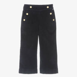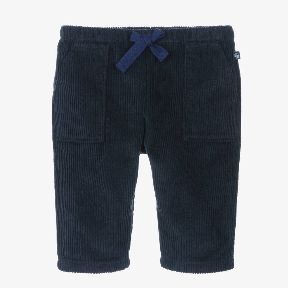Navy blue trousers for little boys by Petit Bateau, made in soft cotton corduroy. Ideal for casual wear, these comfortable trousers have slanted pockets on the front and a decorative bow tie on the elasticated waist. A woven logo tab can be seen on the side seam for a subtle branded touch.