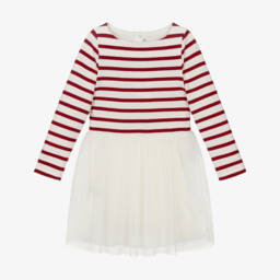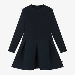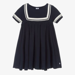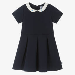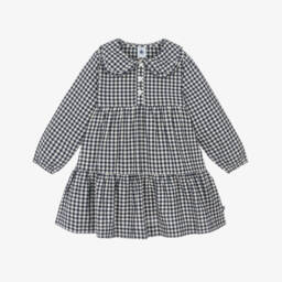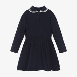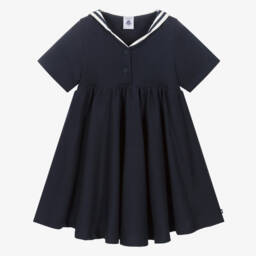 A lovely blue denim dress for little girls by Petit Bateau, made in a soft cotton blend. This sleeveless dress has a pretty frill trim on the bodice and over the shoulders. It fastens neatly on the back with branded buttons.