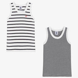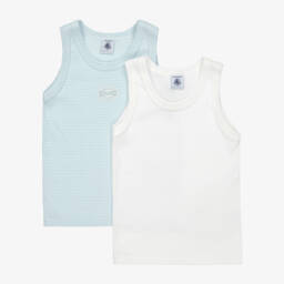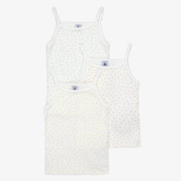 A three-pack of vest tops for girls by Petit Bateau, in shades of green, ivory and white. Made from super soft cotton jersey, these sleeveless tops are ideal as a base layer or paired with their pyjama bottoms. They have sweet love heart patterns and scalloped stitching, with a satin bow detailing the plain style.
