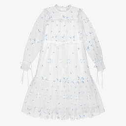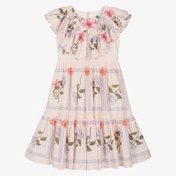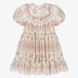 Beautiful ivory linen voile dress for girls by Petite Amalie, with a floral bouquet print in orange and purple. With frills over the shoulders, it has gorgeous, oversized, puffed sleeves and fastens with a concealed zip on the back.