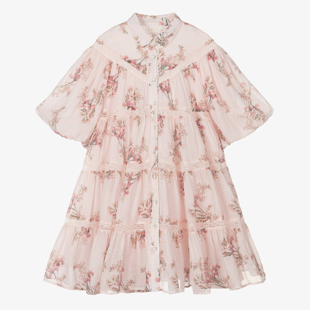 Girls blush pink floral dress by Petite Amalie, with a gorgeous voluminous shape and elbow-length puffed sleeves. Soft and lightweight with a cool cotton lining for comfort, it has a vintage-inspired print and delicate lace trims, giving it a timeless feel.