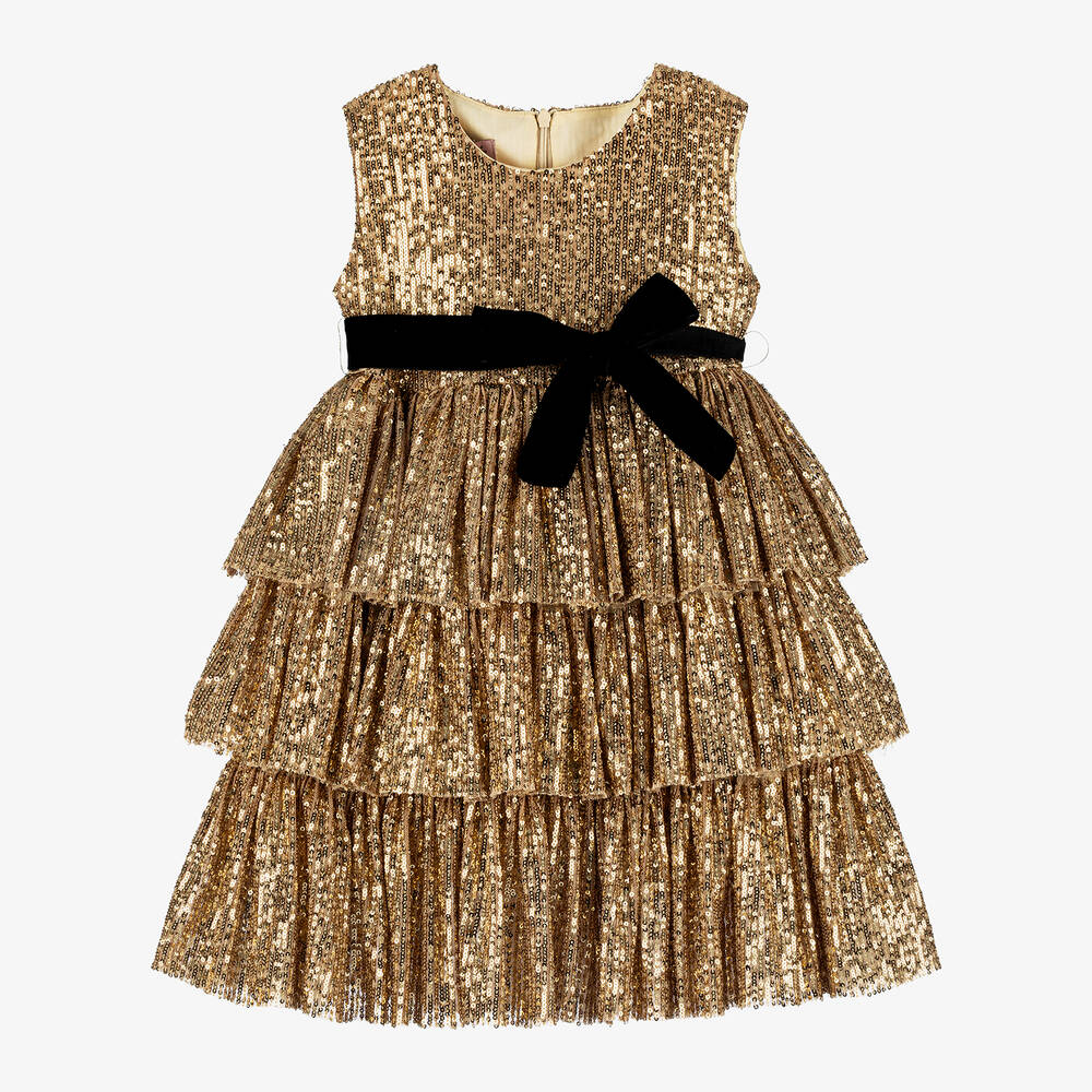 A stunning gold sequin special occasion sleeveless dress for girls by Phi Clothing. Ideal for parties, it has a layered tiered skirt and a detachable contrasting black velvet ribbon belt that can be secured into a pretty bow. Lined in lightweight cotton, it fastens with a concealed zip on the back for a neat finish.