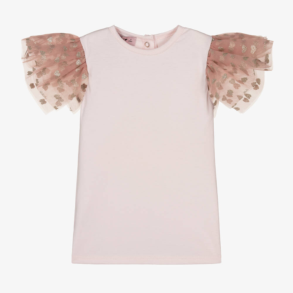Pale pink T-shirt for girls by Phi Clothing, made in soft and stretchy cotton jersey. This pretty tee has short sleeves made in layers of dusky pink tulle patterned with glittery gold stars. Cool and comfortable for easy wear, it has popper fastenings on the back.