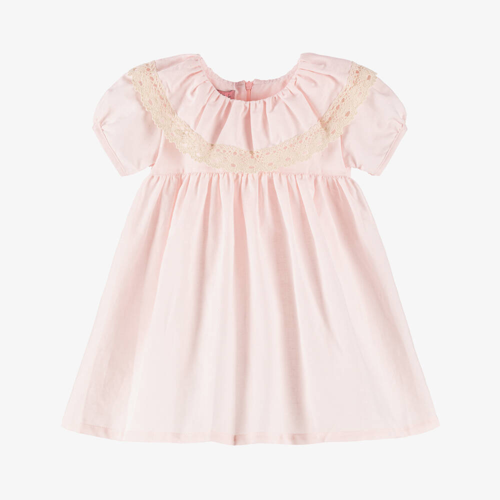 Girls pink dress by Phi Clothing, combining classic elegance with a delicate touch. Made from a soft blend of linen and cotton, the dress features a charming ruffle collar with ivory lace trim. The short puffed sleeves and relaxed fit make it ideal for warmer days, ensuring both comfort and style for both special occasions or casual outings.