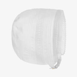 Wonderfully charming, this white bonnet for little girls is by Phi Clothing. Made from soft cotton with a lightweight lining, it is decorated with a pretty lace trim and has a delightful bow embellishment on one side for a feminine look. Subtly elasticated at the back for a comfortable fit, it has a chin strap that fastens with a button on one side.