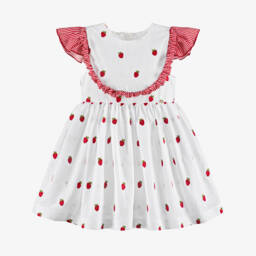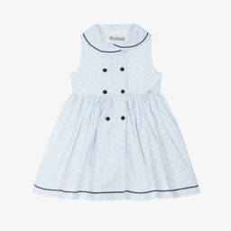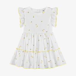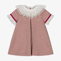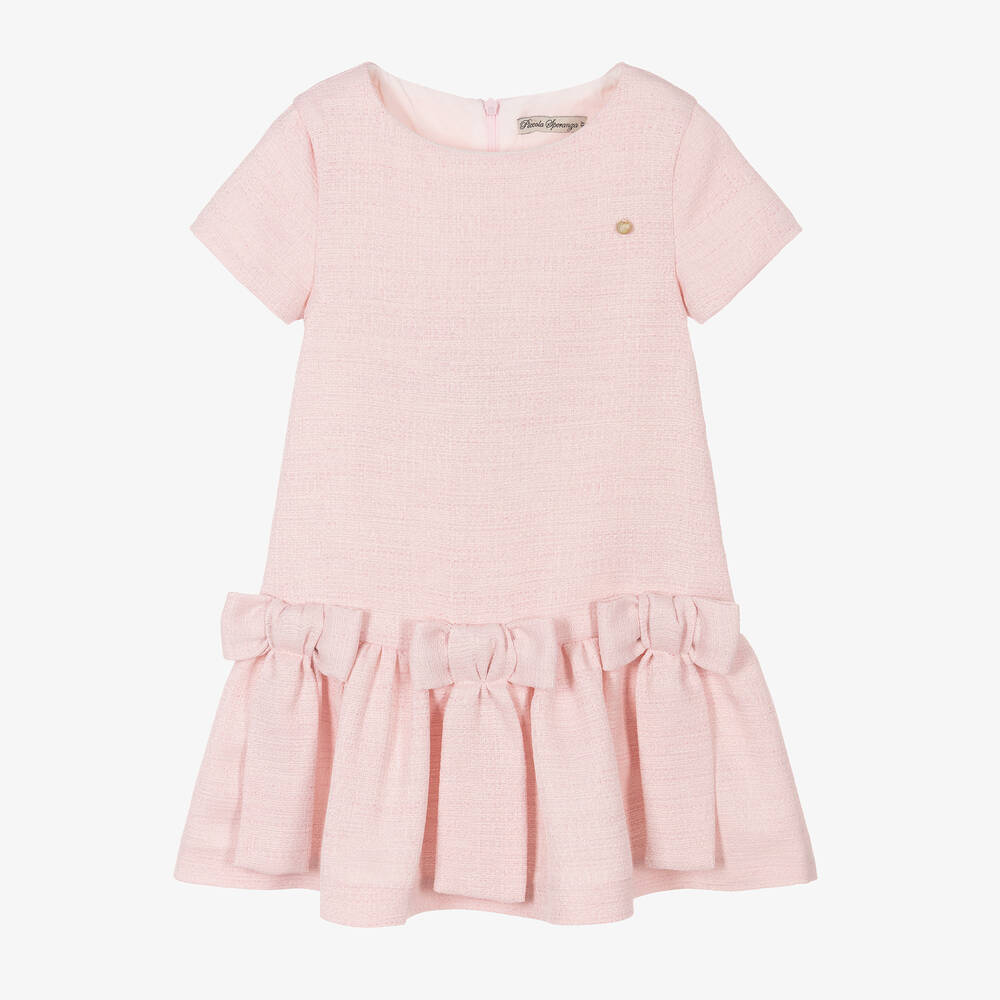 Pretty pink dress for girls by Piccola Speranza, made in a textured, tweed-effect cotton blend. Fully lined, with short sleeves, it has lovely bows on the front of the dropped waist and a mother-of-pearl logo disc on the chest. This smart dress fastens neatly on the back with a concealed zip.