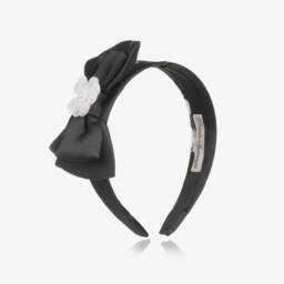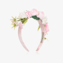 A pretty white hairband for girls by Piccola Speranza. The flexible band is covered with grosgrain fabric and adorned with pink satin and white tulle flowers for a lovely finish.