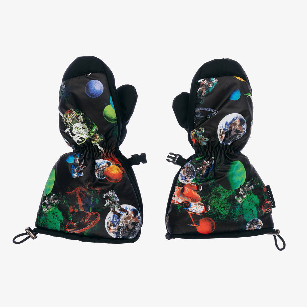 Black ski mittens for boys by Pilguni, with a colourful space-themed design. Made in silky smooth waterproof fabric, they provide optimum protection on the slopes and beyond. Warmly padded with isosoft insulation, they have a cosy polar fleece lining, carabiners to clip the mittens together and an adjustable drawstring at the wrists to keep out the wind and snow.