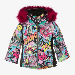 A pink waterproof ski jacket for girls by Pilguni, patterned with white stars in varying patterns. Padded with Isosoft insulation, this fleece-lined jacket is elasticated on the waist and offers warmth and comfort while on the slopes. The zip-on hood is detachable and trimmed with a removable faux fur edge for a different look. Inside the jacket, are elasticated black shoulder straps and a practical snow skirt with secure popper fastenings. Other details include fleece-lined zip pockets, ribbed knit cuffs and a ski pass pocket on one sleeve. There is a light reflective band on one cuff for added safety.