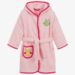 Hooded aqua blue bathrobe for boys and girls by Playshoes. It is made in soft cotton towelling for soft and cosy wear. With two pockets on the front, there is a detachable sash tie belt around the waist for easy fastening.
