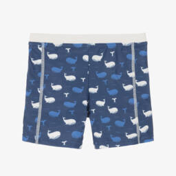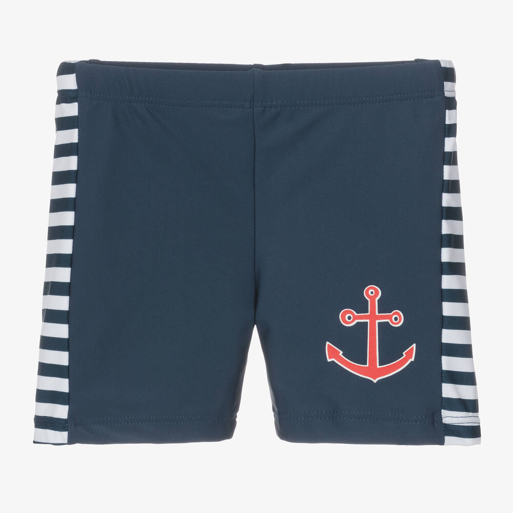 Boys navy blue swim shorts by Playshoes, with UPF 50+. Great to wear by the pool or on the beach, they have a stretchy jersey front lining for comfort, stripy panels on the sides and a red anchor motif on the front.