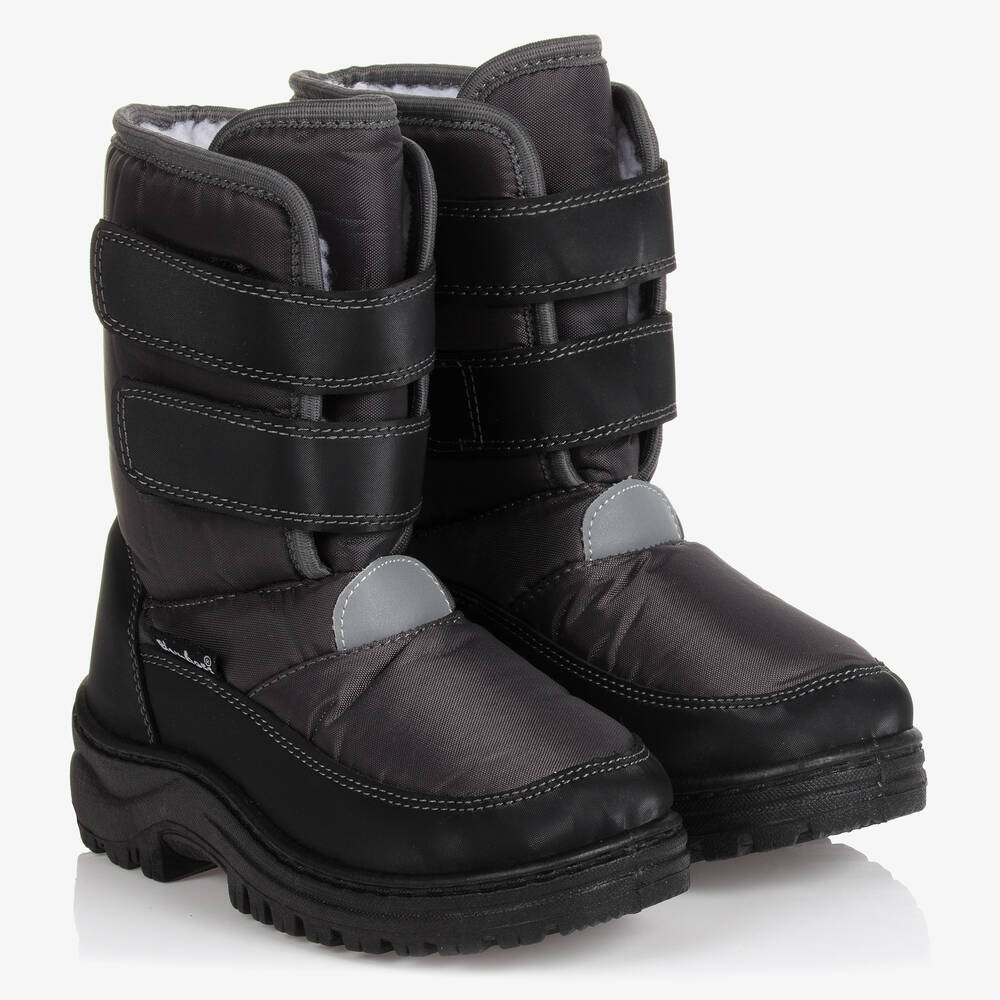 Technical grey snow boots for boys and girls, by Playshoes. With silky nylon water repellent uppers, they have velcro fastening straps across the front and reflective trims for added safety. Lined in cosy fleece, the chunky outer soles have a jagged sole for good grip and are made from waterproof rubber, ideal keeping feet dry whilst playing the snow.