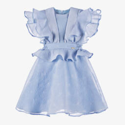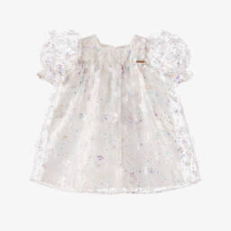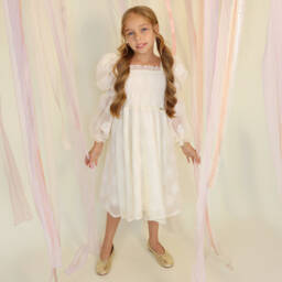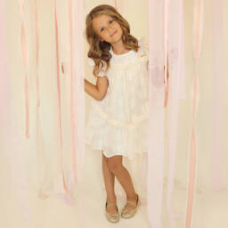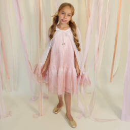 A pink special occasion dress for younger girls from POCA & POCA. Woven with iridescent thread for a glittery, textured feel, it is comfortably lined in lightweight cotton and fastens with a concealed zip and gold-tone buttons on the back. This delightful sleeveless style has an oversized collar for coverage over the shoulders, forming a chic bow detail on the back.