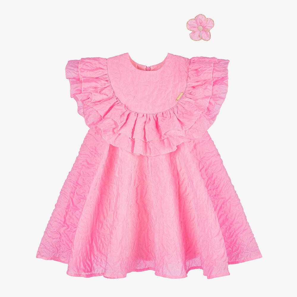 Exclusive to Childrensalon from POCA & POCA, a pretty bright pink dress for girls made in crinkle-effect jacquard fabric. Ideal for a special occasion, this show-stopping dress has an exaggerated flared skirt and large ruffle detailing. To complete the look, it comes with a gold-trimmed flower hair clip.