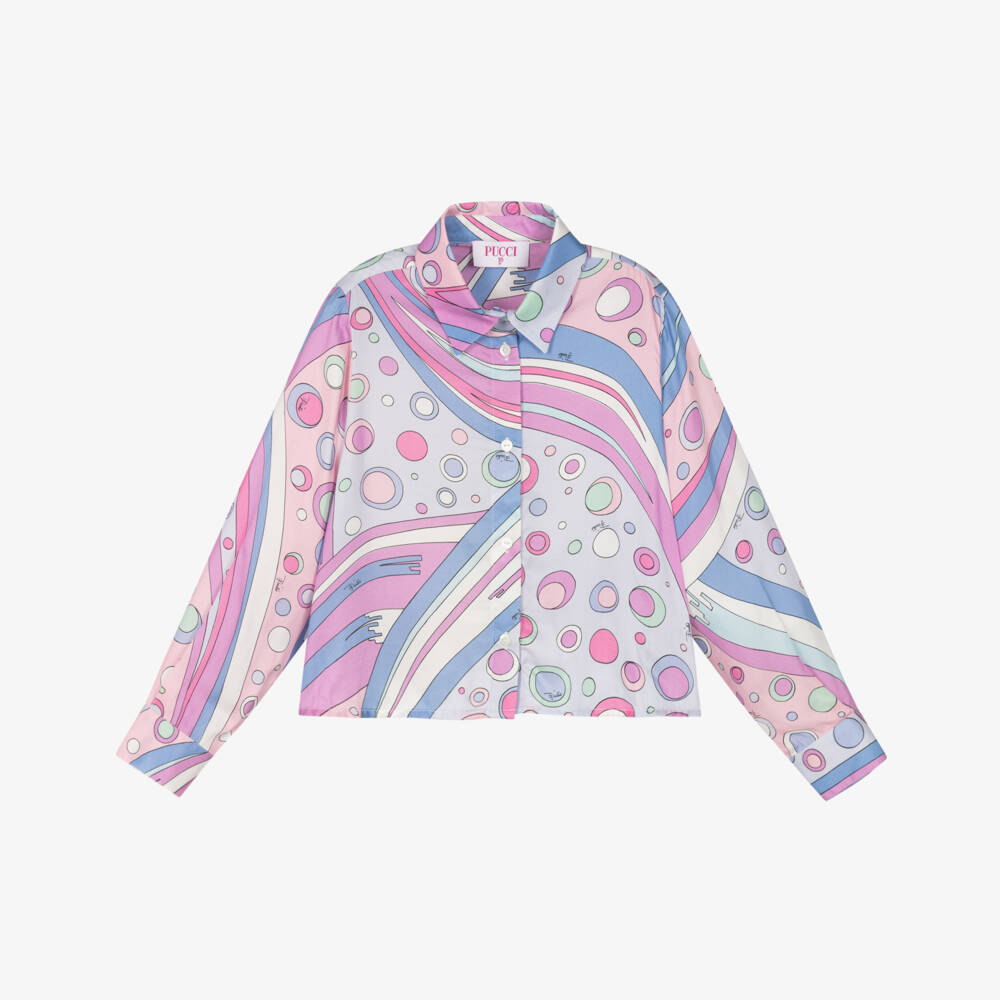 Effortlessly stylish blouse for girls by luxury Italian label PUCCI, with their distinctive Fontane print in shades of pink, lilac and blue. Lovely for smart occasions, it is softly woven in silky viscose twill. There are branded button fastenings on the front and cuffs to complete the look.