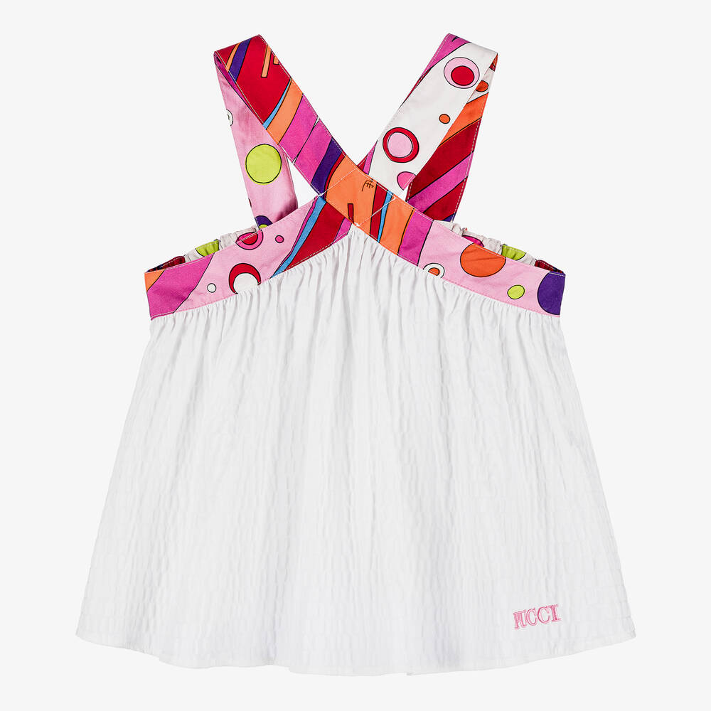 A white top for girls by luxury designer PUCCI, made in a soft cotton blend for those warm, sunny days. The lightweight fabric has a textured look and the contrast pink trims are patterned with the brand's brightly coloured Fontane motifs. It is elasticated across the back for added comfort.
