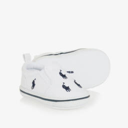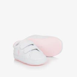 Baby boys faux leather pre-walker trainers by Ralph Lauren, designed in classic white with vibrant red and green accents. These super lightweight trainers are branded on the tongue and embroidered with the iconic Polo logo. The mesh interior ensures a comfortable feel for little feet, while the velcro strap makes dressing easier.
