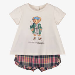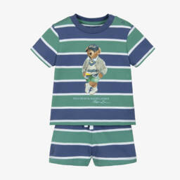 In blue and yellow, this casual cotton shorts set for baby boys is by Ralph Lauren. The soft piqué shorts have front pockets and a comfortable elasticated waist with a faux drawstring. The striped jersey T-shirt has shoulder poppers to help with dressing and a small green embroidered pony logo for a signature finish.