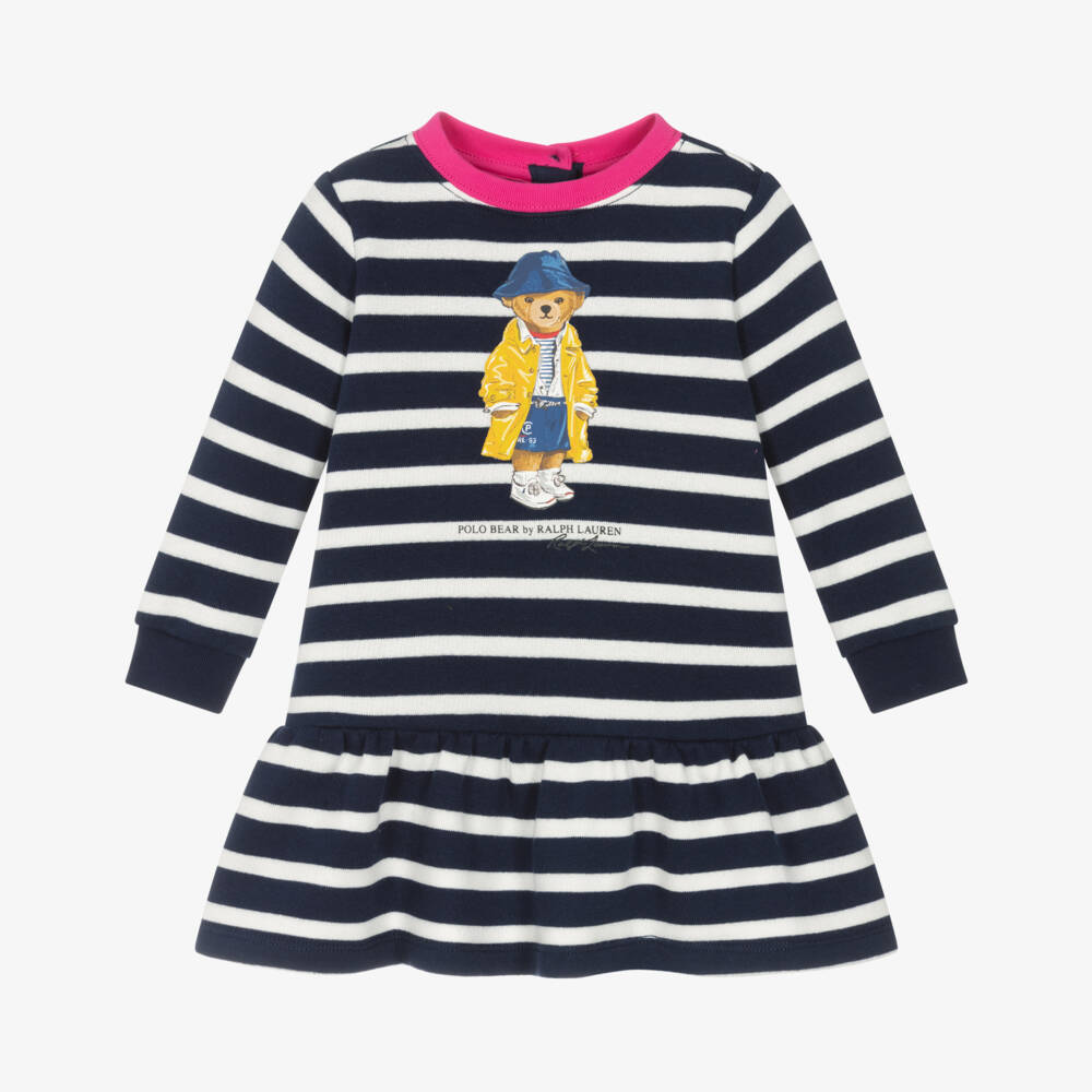 In a navy blue and white stripe, this sweet dress for baby girls is by Ralph Lauren. It is made in soft cotton jersey and depicts the brand's iconic Polo Bear on the front. It has a pretty gathered skirt and fuchsia pink trim around the neckline. The dress fastens with buttons on the back and comes with a pair of matching knickers to complete the look.