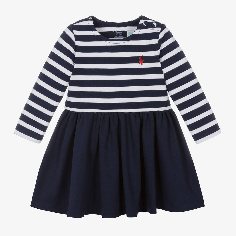 Baby girls navy blue and white striped dress by Ralph Lauren, made in a soft viscose blend with added stretch. A long-sleeved style, this cute and comfortable jersey dress has fabric-covered buttons on one shoulder and a signature pony logo embroidered on the chest in red. It comes with a pair of plain blue cotton knickers to be worn over a nappy. They are elasticated on the waist and legs for comfortable wear.