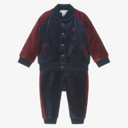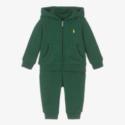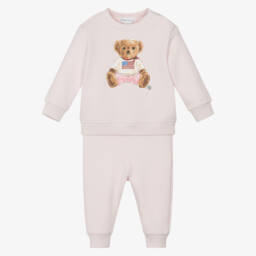 Cosy pale pink tracksuit for baby girls by Ralph Lauren, made in mid-weight cotton jersey with a warm, fleecy inside. The hooded, zip-up top has patch pockets on the front and a tonal pony logo embroidered on the chest for a signature finish. The joggers have a fixed bow trim on the elasticated waistband.
