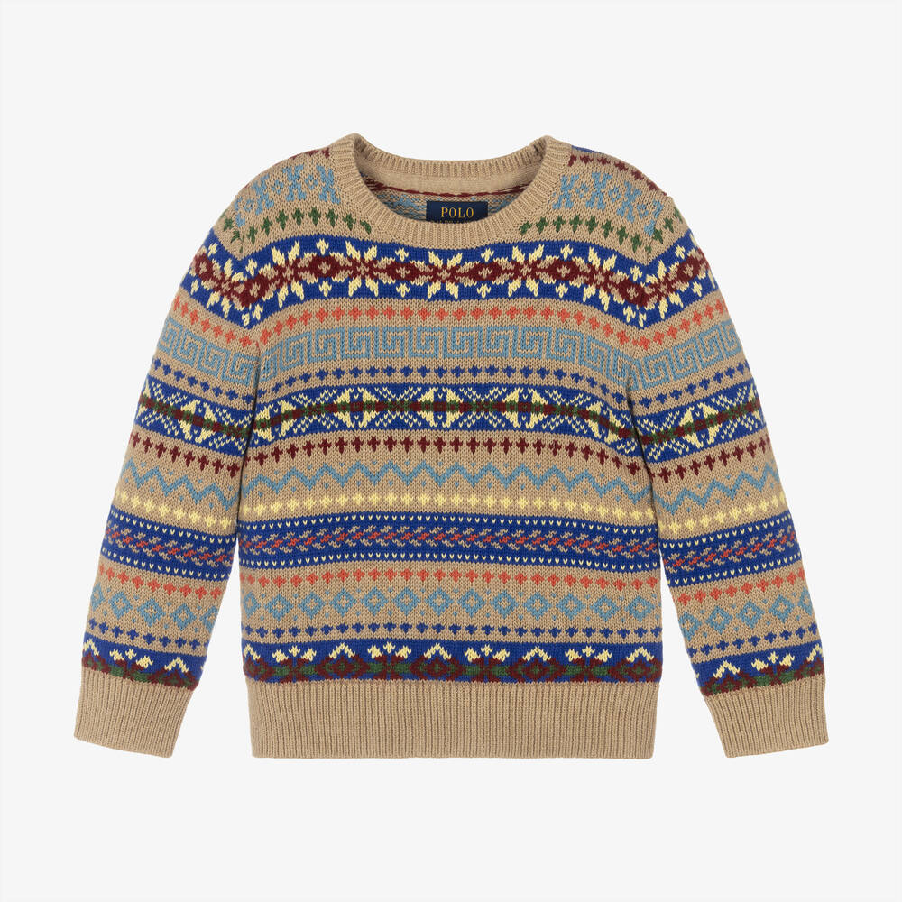 A classic look for boys, this beige jumper from Ralph Lauren has a stylish Fair Isle pattern in shades of blue, yellow and orange. It is knitted in a luxurious cotton and wool blend for cosy warmth and has a crew neck and ribbed trims.