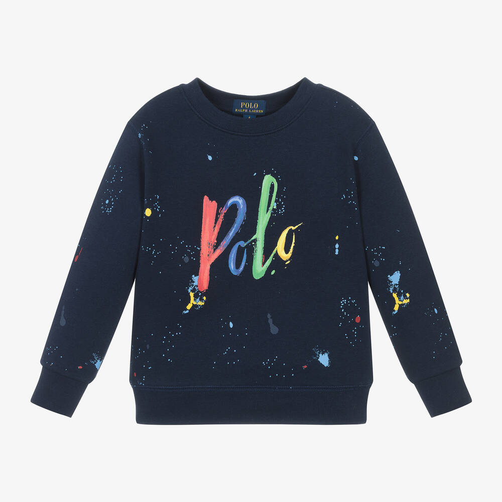 Casual navy blue cotton blend sweatshirt for boys by American brand Ralph Lauren. It has a colourful, painted-effect logo printed on the front, with paint splatters all around. Made in comfortable, stretchy jersey with a fleecy inside and long sleeves, it has neat ribbed trims for cosiness.