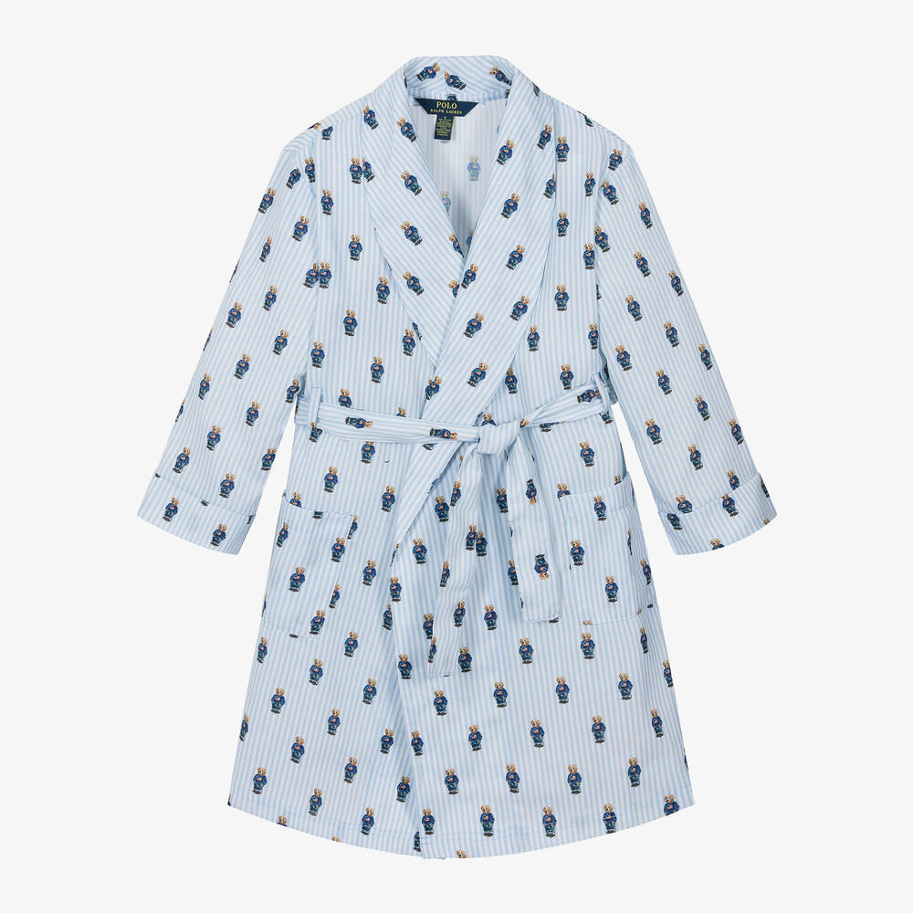 White and blue striped dressing gown for older boys by Ralph Lauren, patterned with the brand's iconic Polo Bear for a distinctive look. Soft and lightweight, this traditional style has a shawl collar and useful patch pockets. A removable tie belt on the waist completes this easy-to-wear design.