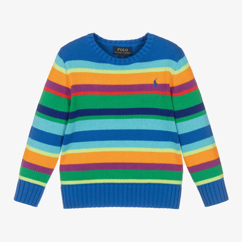 Stylish blue sweater for boys by Ralph Lauren, knitted in soft cotton. With hues of green, orange and purple stripes this fun sweater is finished with the brand's pony logo embroidered on the chest for a designer touch.