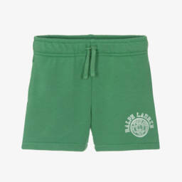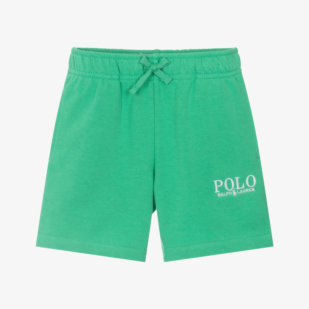 Bright green shorts for boys by Ralph Lauren, made in a comfortable cotton jersey blend. These casual shorts are embroidered with a Polo Ralph Lauren logo below the left pocket. The drawstring waistband ensures a good fit.
