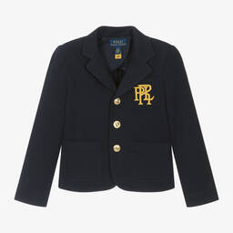 Boys navy blue blazer by Ralph Lauren, made in mid-weight cotton twill with a single vent on the back. This single-breasted piece has multiple pockets and a neat buttonhole on the left lapel. It has decorative buttons on the cuffs and an extra interior pocket inside the jacket. A blue logo tab is stitched on one sleeve for a signature finish.