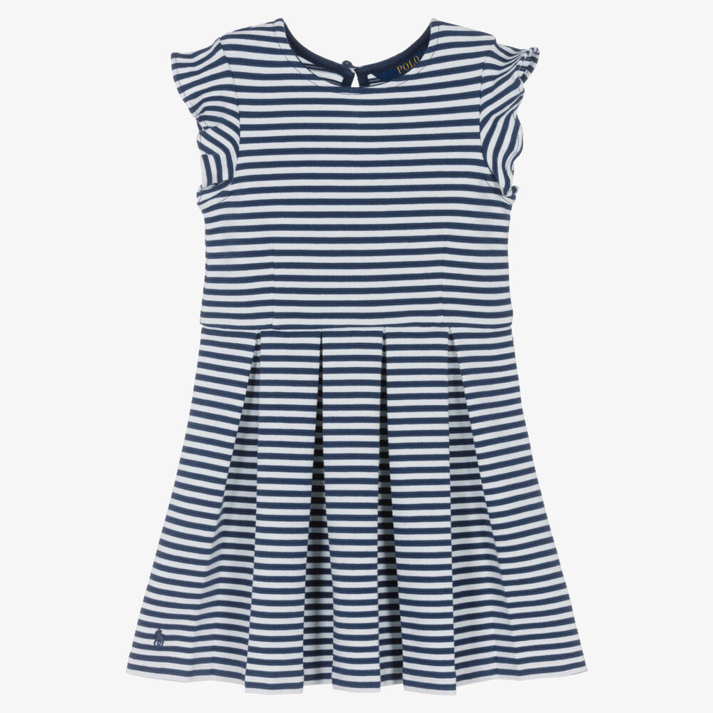 Pretty navy blue and white striped skater style dress for girls by Ralph Lauren, made in soft and stretchy, mid-weight ribbed cotton jersey. It has a pleated skirt and feminine flutter cap sleeves. There is a single button fastening on the back and the brand's signature pony logo is embroidered in navy blue by the hem.