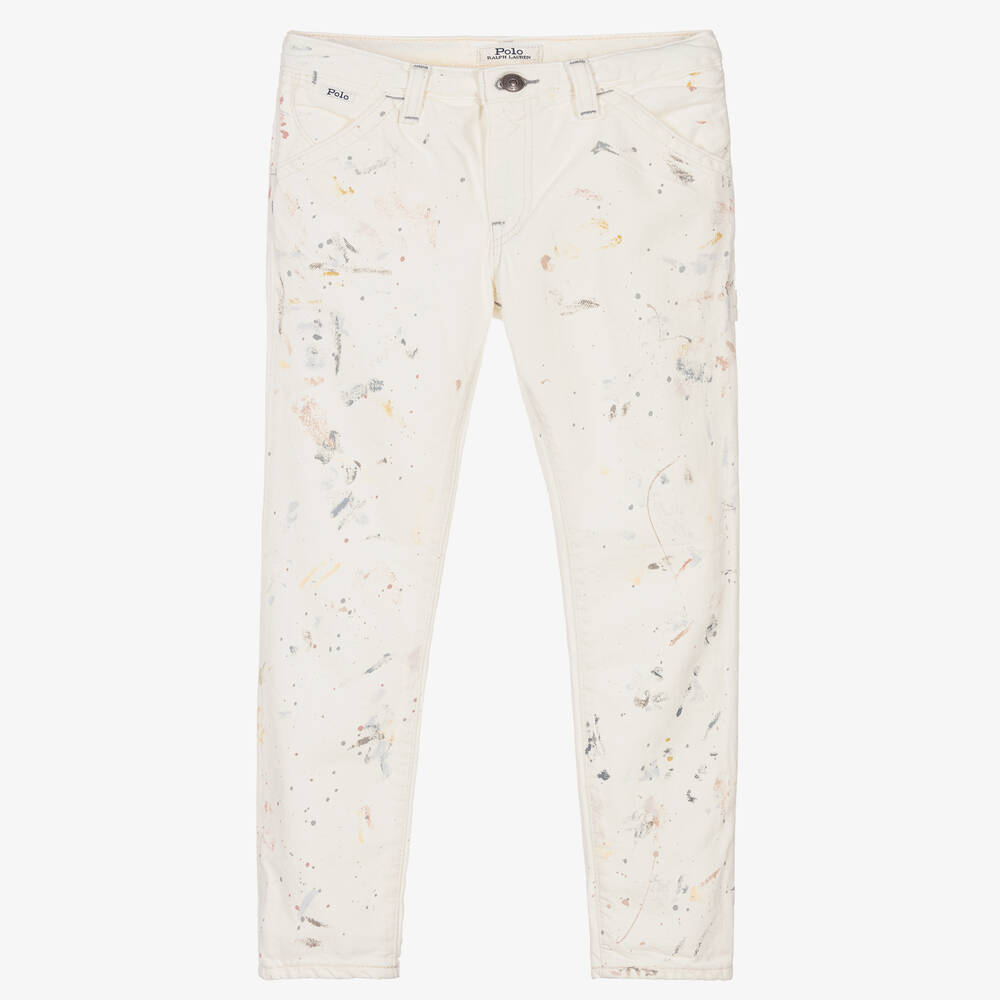 Ivory slim-fit denim jeans for girls by Ralph Lauren, made in a soft cotton and lyocell blend. This stylish five-pocket design has a fun paint platter effect all over in grey, yellow and brown. There is a comfortable adjustable waistband for a good fit, with a branded tab on the front for a signature look.