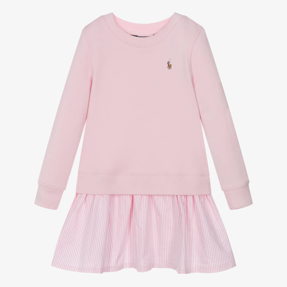 Casual and comfortable for girls, a pale pink sweatshirt dress by Ralph Lauren. Made in mid-weight cotton-blend jersey, it has a contrasting pink and white striped skirt woven in smooth Oxford cotton. A multicolour small pony logo embroidered on the chest adds a signature finish.
