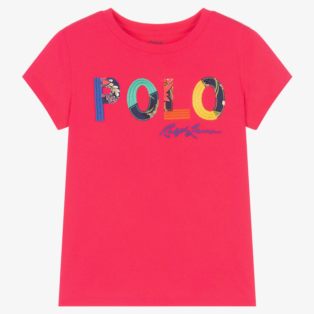 A casual bright pink T-shirt for girls, made in soft and stretchy cotton jersey. Unmistakably Ralph Lauren, this casual crew neck has a vibrant, tropical-theme multicoloured logo embroidered across the front for a distinctive branded look.