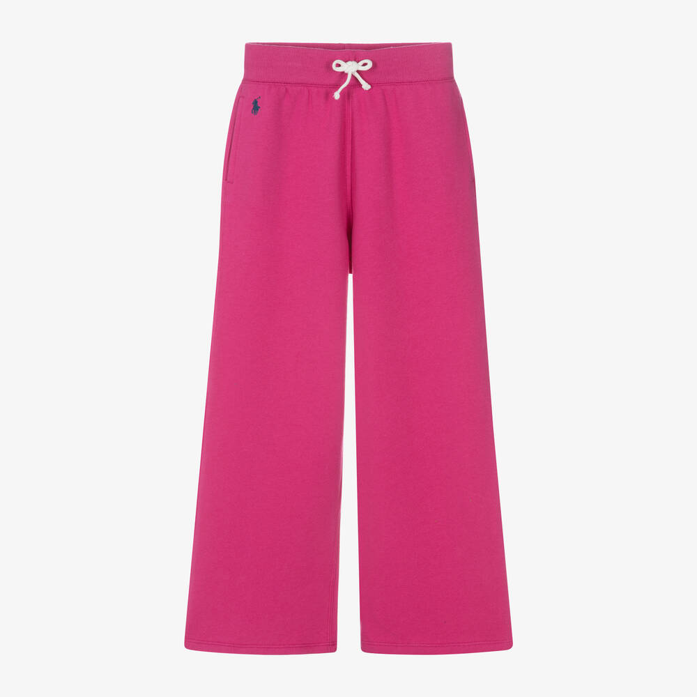 Bright pink cotton joggers for girls by Ralph Lauren, with a wide leg fit. Made in soft, comfortable jersey, with a warm, fleecy inside, they have side seam pockets and a drawstring fastening for the ideal fit. The signature pony logo is embroidered on one side in navy blue.