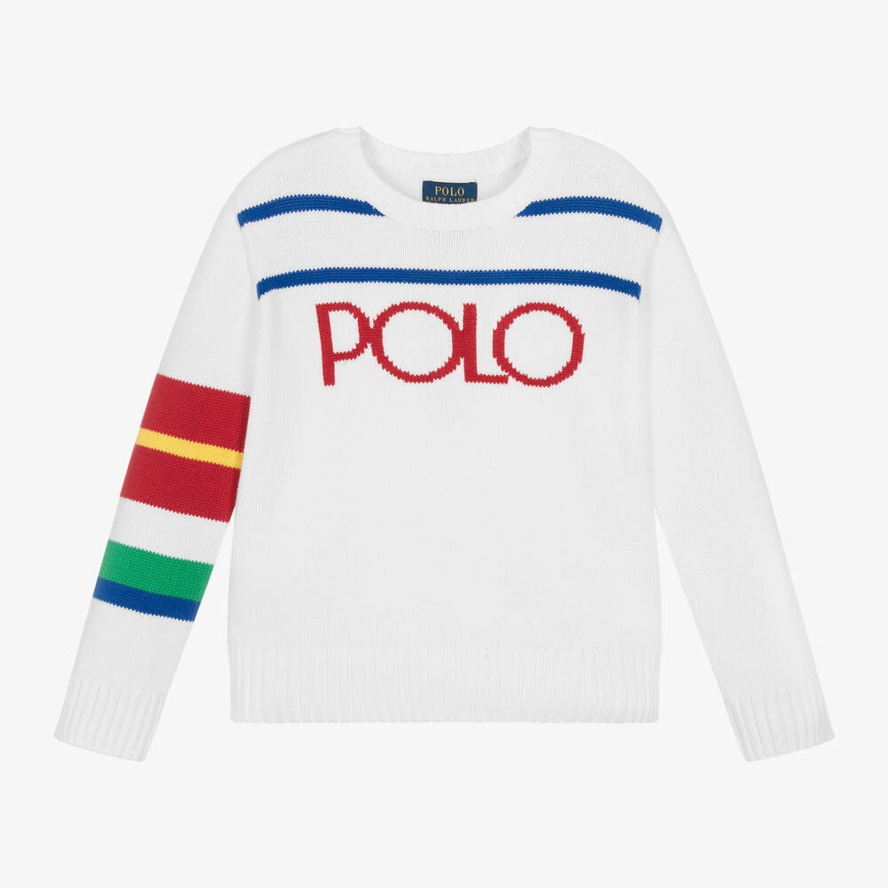 White cotton sweater for girls by American brand Ralph Lauren, with blue intarsia stripes and a red logo across the chest. In a warm mid-weight knit, it has cosy ribbed trims, just right for cooler weather, and long sleeves with colourful stripes on one side.