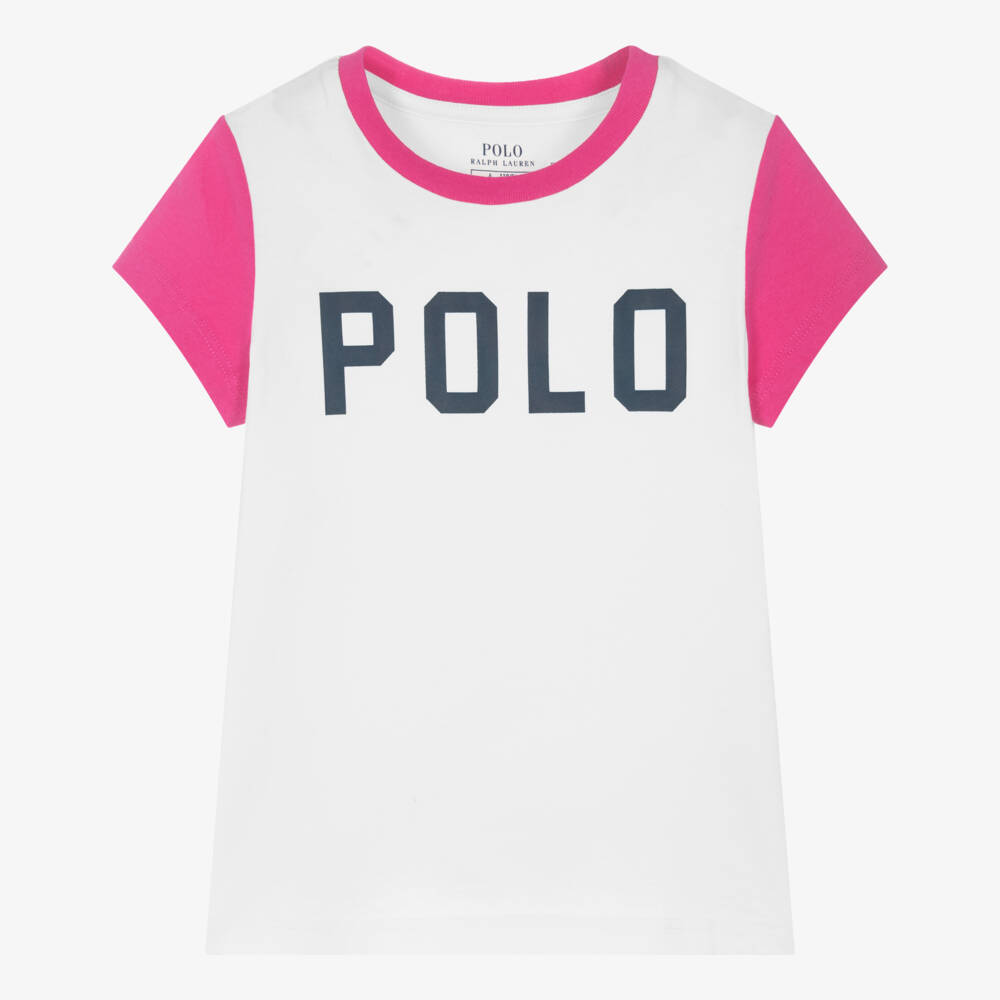 White with fuchsia pink trims, this POLO branded T-shirt for girls is by Ralph Lauren. Casual and comfortable, it is made in soft cotton jersey.