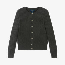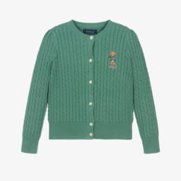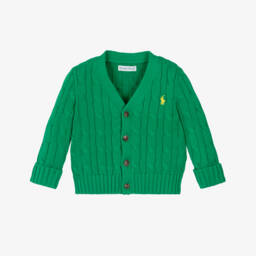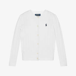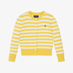 Girls yellow cotton cardigan by Ralph Lauren, in a softly textured cable knit. This layering piece has neat ribbed trims and branded button fastenings. It has a pink Pony logo embroidered on the chest, adding a signature finish.
