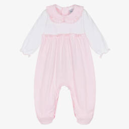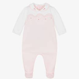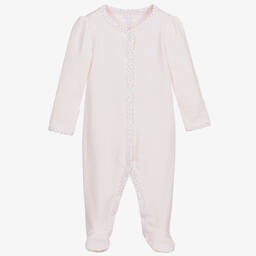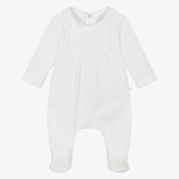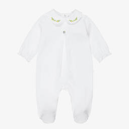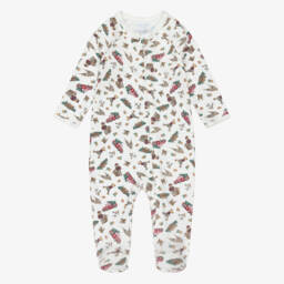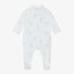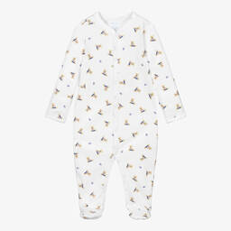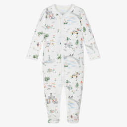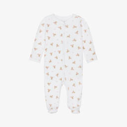 An adorable white cotton babygrow for boys and girls by Ralph Lauren, made in beautifully soft jersey. Patterned with grey nursery-themed prints, it features teddy bears, elephants and alphabet blocks. There are easy popper fastenings on the front and useful fold-over scratch mitts.