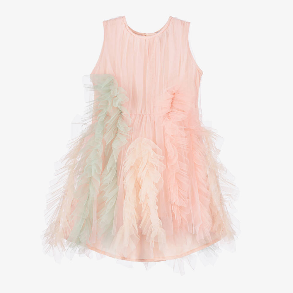 Ideal for a party or special occasion, a pale pink dress for girls from RaspberryPlum. Made from soft, lightweight tulle with green and ivory ruffle detailing for a fun finish, this lovely dress is lined with super soft viscose for comfort.