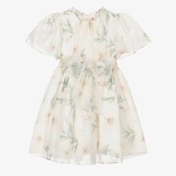 This party and special occasion dress for girls in champagne ivory, is designed by Romano Princess. The pleated bodice and skirt have a soft feel tulle overlay and petal-shaped cape and sequin embroidered flowers. A pretty waistband is decorated with five rose brooches, with a concealed zip and bow at the back. Sizes up to age two come with a headband. Sizes 4-14 years come with a matching handbag.