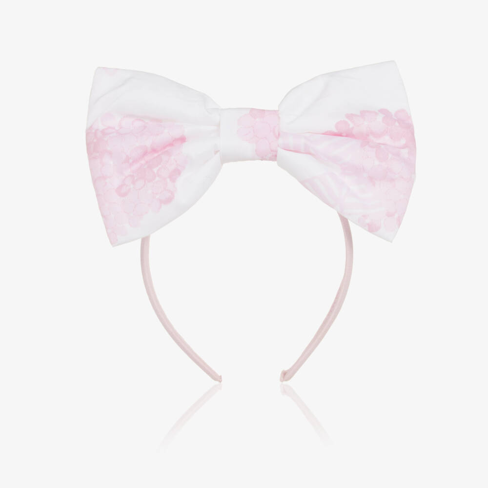 To elevate any hair look, this lovely white and blossom pink hairband for girls is designed by A Dee. The narrow band is covered in soft cotton jersey fabric and topped with an eye-catching, floral print bow.