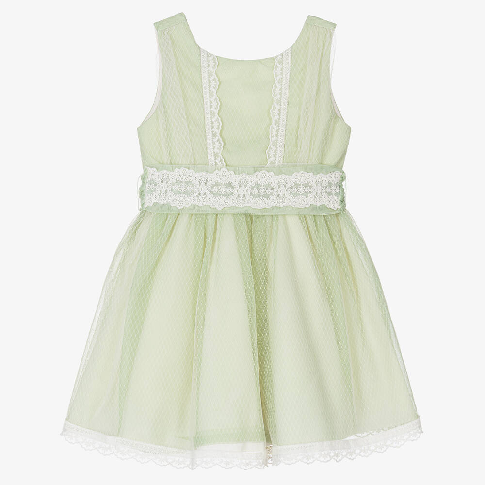 A pretty light green and ivory dress for girls by Abel & Lula, with a diamond-patterned tulle overlay. Ideal for a special occasion, it has cotton lace trims on the bodice and a beautiful scalloped hem on the skirt. The embroidered florals add traditional charm. It has mother-of-pearl buttons on the back and a detachable sash belt tied around the waist. Two layers of soft cotton blend fabric with a tulle trim line the skirt for added volume and comfort.