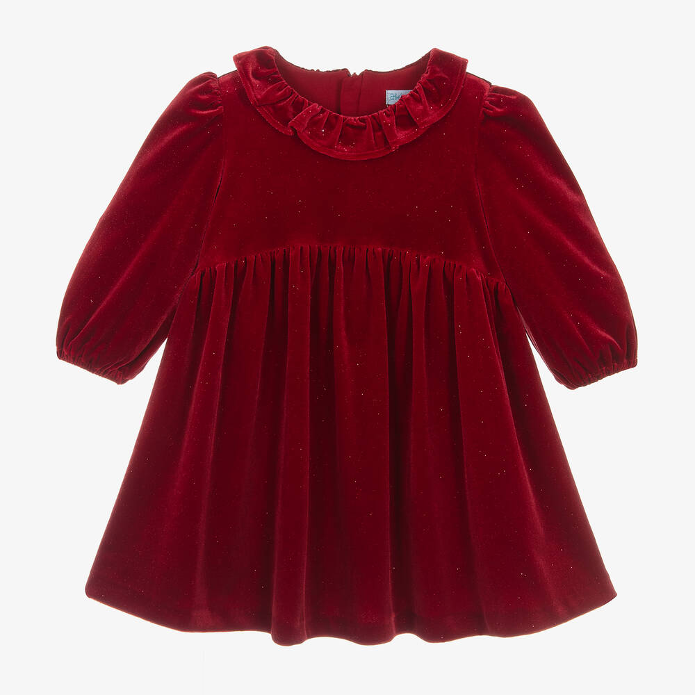 Pretty red dress for girls by Abel & Lula, made in soft velvet with a glittery effect. It has a ruffle collar and long sleeves, gently puffed at the shoulders, with elasticated cuffs. Simple yet stylish, it is fully lined for comfort and has a full skirt ideal for twirling. It fastens neatly with a concealed zip on the back.