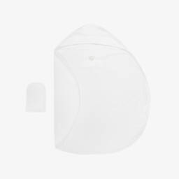 Ivory hooded towel for baby boys and girls from Absorba. Featuring soft and absorbent organic cotton towelling on both sides, it has super soft, velour hood and trims. The hood has a subtly textured cloud pattern with an 'amour' embroidery, and a handy little red striped loop to hook on.