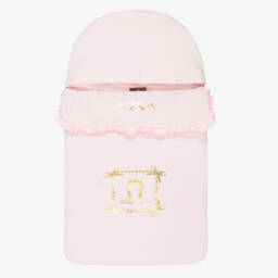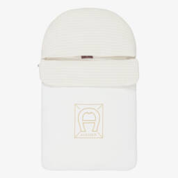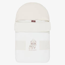 Pale blue nest for baby boys by AIGNER, patterned with a blue logo and teddy bear design. Made in beautifully soft Pima cotton jersey, it is gently padded for warmth and fastens with a zip down one side and across the base. It has a branded fold-down front and little 3D ears on the top of the hood for a cute finish.