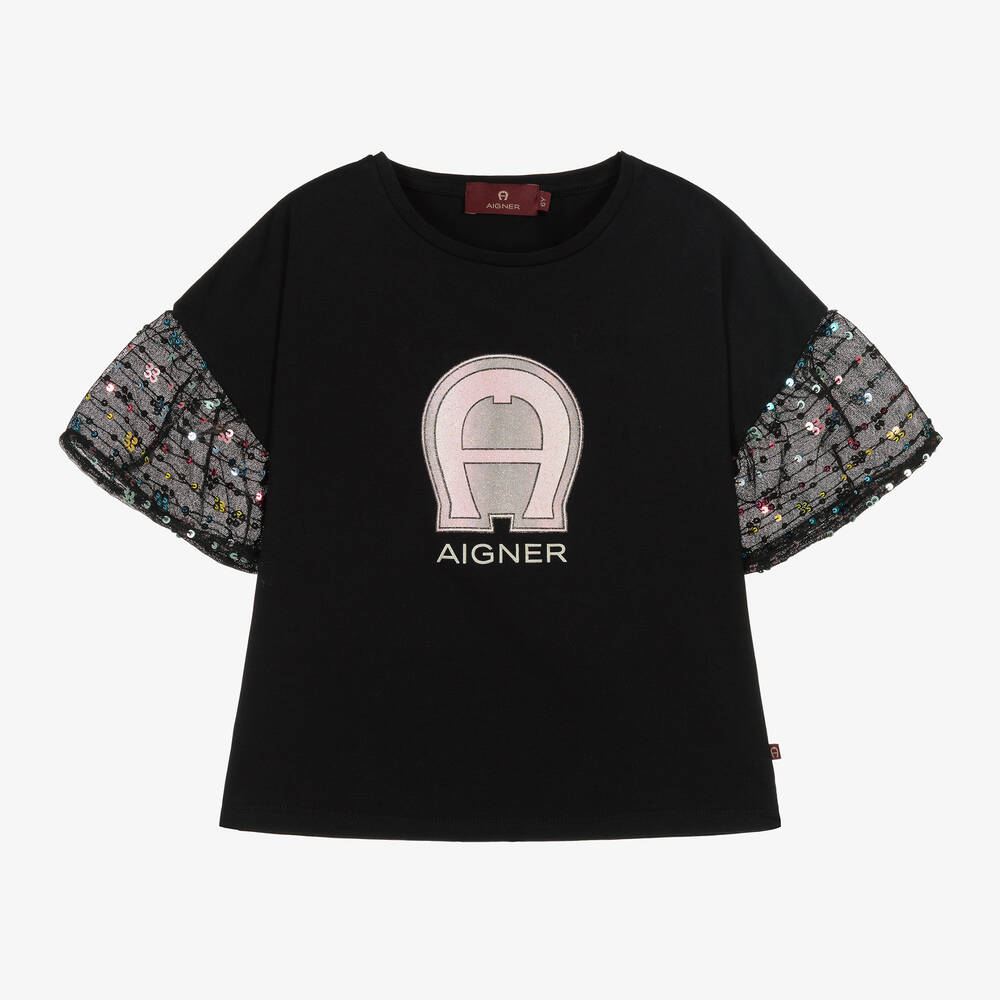 In a stylish boxy fit, this black T-shirt for girls by AIGNER, has a pink and glittery gold 'A' horseshoe logo motif on the front. It is made from soft and comfortable cotton jersey, with semi-sheer tulle sleeves, embellished with colourful sequins.