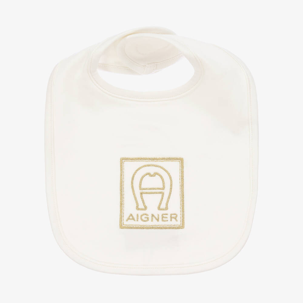 Ivory bib for baby boys and girls by AIGNER, made in soft and stretchy Pima cotton jersey. This useful feeding accessory has the brand's signature 'A' horseshoe logo embroidered on the front in gold. It fastens easily with velcro on the back of the neck.